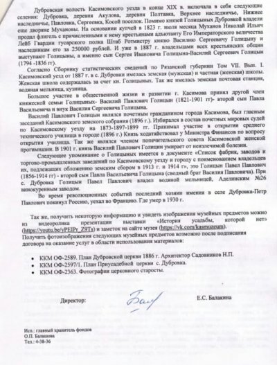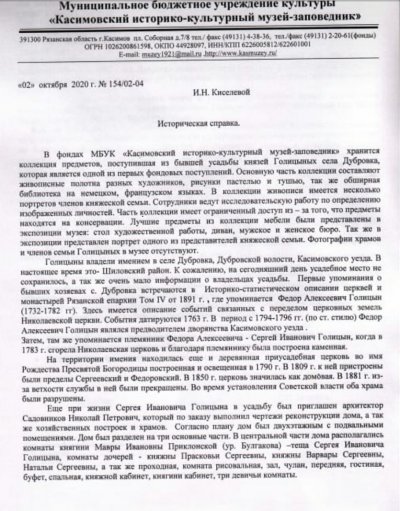 Историческая справка от 2 октября 2020 года, полученная из Касимовского краеведческого музея.