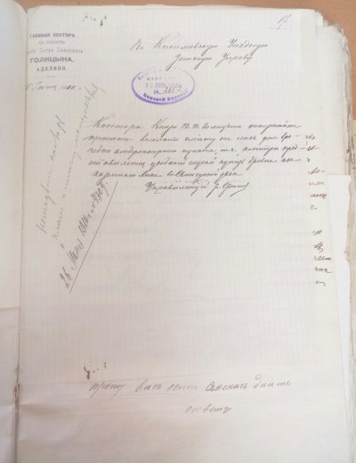 Фото письма управляющего Сердюкова в Касимовскую Земскую Управу с просьбой выслать смету на покупку леса от 5 июня 1910 года. "Контора князя П.П.Голицына покорнейше просит выслать смету на лес для врачебно-амбулаторного пункта, т.к. конторе предоставляется удобный случай купить бревна из казенного леса Свинчусской дачи". Внизу листа приписка:Прошу Вас Осип Семеныч дайте ответ.