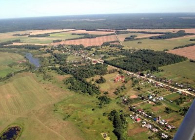 Фото Сергея Панина. 2012 год. Вид на Дубровку сверху. Дорога из Дубровки в Акулово. Слева река Средник. В центре бывшего Голицынского парка видны два особняка, вокруг которых вырублено большое количество парковых деревьев. Справа от дороги большой зеленый массив квадратной формы - барский сад.