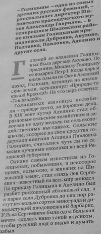 "Одним из первых владельцев села Дубровка и близлежащих сел был ГОЛИЦЫН Михаил Михайлович (1675–1730 гг.).... .Затем имение унаследовал сын Аделаиды Павловны и Василия Сергеевича, Владимир Васильевич (1830–1886 гг.), женатый с 1858 г. на своей кузине Елене Михайловне (1831–1885 гг.), дочери князя Михаила Михайловича Голицына. Детей они не имели, поэтому имение перешло к другой ветви Голицыных – владельцем Дубровки стал ГОЛИЦЫН Лев Сергеевич (1845–1915 гг.)....В Дубровках и Аделине он строит винокуренные заводы, в Дубровках рядом с имением посадил огромный сад, где выращивал яблони и вишни, а также предпринимал попытки культивирования винограда....Затем имение возвратилось к предыдущей ветви Голицыных, к сыну Павла Васильевича (1822–1871 гг.) – брата Владимира, – Петру"/Александр Гаврилов " Люди земли Шиловской", Электронный сайт "Проза.ру".