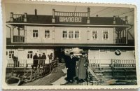 Фото из семейного альбома Щербаковой Л.С. Пристань в Шилове. На фоне пристани, предположительно, справа Михаил Щербаков.