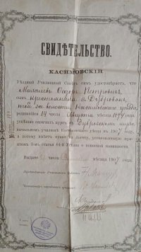 Второй дедушка у меня – Михалев Федор Петрович. Он окончил Дубровское мужское начальное училище. Когда я была в Касимовском музее, я видела там такое же свидетельство, какое вот у меня от дедушки лежит.
