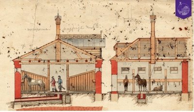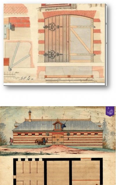 План. Конюшня князей Голицыных. Вторая половина 19 века. Село Дубровка. Касимовский историко-культурный музей-заповедник. На рисунке изображены фрагменты, архитектурные элементы здания конюшни. В первой части -часть крыши, помещение конюшни в разрезе. Ниже: принцип кирпичной кладки, ворота, соединительные механизмы/Наталья Елманова" Усадьба Голицыных в селе Дубровка"