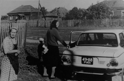 Фото из семейного альбома Сухоручкиной А.С. Екатерина Слепова возле дома Сухоручкиных в Степакине. Рядом с машиной стоит Мария Павловна Губанихина (Самсонова). Напротив дом - Луканиных, слева - Путилиных. 1967 год. Дубровка.