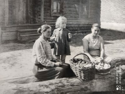 Фото из семейного альбома Лукашиной Л.В. Лукашина Екатерина Николаевна со своей старшей снохой и внучкой Лидой возле дома в Марьиной деревне.