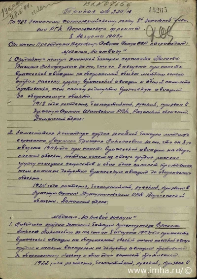 (Приказ 220/н от 8 августа 1943 года от имени Президиума Верховного Совета Союза ССР награждают медалью "За отвагу" орудийного номера зенитной батареи сержанта Пылаева Василия Никифоровича за то, что он 8 августа при налете вражеской авиации на обороняемый объект метким огнем орудия рассеял группу вражеской авиации и сбил 2 самолета противника, тем самым не допустил вражескую авиацию до обороняемого объекта) /https://pamyat-naroda.ru