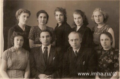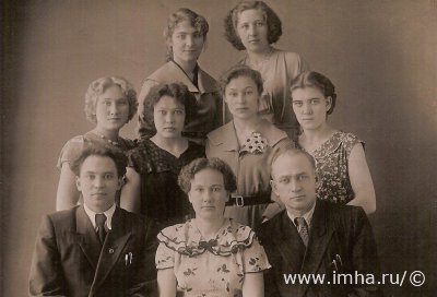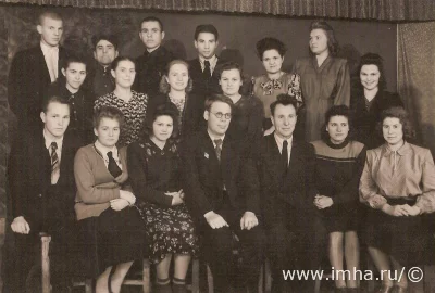 Фото из семейного альбома Тимакина Н.П. Учительский институт. Южно-Сахалинск. 5 ноября 1951 года. Нижний ряд в центре: Жеребцов Борис Александрович, заместитель директора по научной работе Сахалинского областного краеведческого музея, рядом Люляков Петр Кириллович, заведующий кафедрой истории Учительского института. В верхнем ряду в центре Тимакин Н.П.