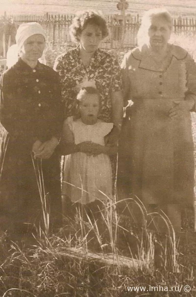 Фото из семейного альбома Тимакиной В.П. Дубровское кладбище. Лунина Наталья Никитична, Тимакина Валентина Петровна, ее дочка Наталья Мишина, Тимакина Раиса Емельяновна на могиле Тимакиной Анны Дмитриевны. 1962 год.