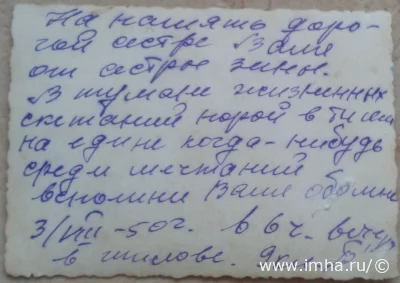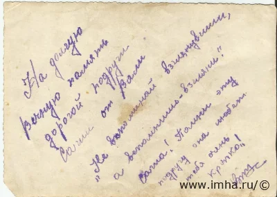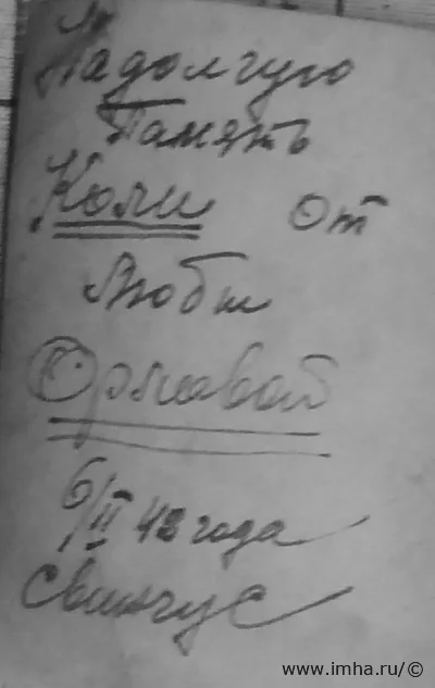 И вот однажды меня вдруг осенила мысль, что я давно не писал писем матери. Я вложил в конверт свою фотографию и написал на ней письмо. Вернувшись домой, как обычно, в двенадцатом часу ночи, я лег спать. Но не успел я погасить свет, как увидел в углу мать. Она стояла, сложив на груди руки, и что-то говорила. Я мог разобрать только свое имя: « Коля, Коля…». Я включил свет, ее образ стал исчезать и совсем пропал. Я попытался опять заснуть и погасил свет. Мать снова стояла в углу и что-то говорила. Только при включенном свете ее образ растворялся. Когда стало светать, я увидел сидящим за столом отца. Он, молча, курил и смотрел куда-то вдаль. Утром принесли телеграмму, что моя мать умерла. Ехала на машине в Шилово, машина перевернулась, удар пришелся на голову, и мать мгновенно скончалась.