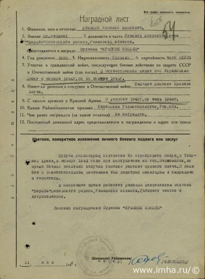 (Загребелин Степан Давыдович. Дата рождения военнослужащего - 1915 год. Время поступления на службу: 06.1942. Место призыва: Шиловский РВК, Рязанская обл., Шиловский район. Воинское звание на момент награждения:гв.ст.лейтенант. Место службы:289 гв. сп 97 гв.сд 1 УкрФ. Награды: Медаль: «За освобождение Праги», Медаль: «За победу над Германией в Великой Отечественной войне 1941–1945 гг.», Орден Красной Звезды, Орден Отечественной войны II степени, Орден Отечественной войны I степени, Орден Красной Звезды. Дата совершения подвига:14.04.1944).