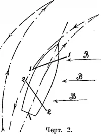 Конечно, все такие меры имели значение для судов парусного флота; при паровом двигателе Дрейф бывает заметен только в исключительных случаях очень свежего бокового ветра или волны, ударяющей в борт судна. В этих случаях и паровые суда должны принимать во внимание Дрейфа при расположении своих курсов. Говорят: «судно лежит в Дейф», когда, поставив часть парусов на один галс, а другую на противоположный ему и держа руль на ветре, достигают того, что судно не имеет хода вперед, а слегка подается в подветренную сторону, описывая при этом зигзагообразные линии (см. черт. 2, где 1,1 и 2,2 – паруса, а В,В,В – направление ветра).