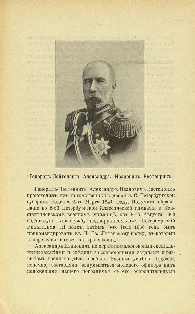[25] "Книга русской скорби", т. IV, СПб., 1910 г., стр. 95-99. Генерал много печатается. Например: Вестенрик А. И. "Голубиная почта, как вспомогательное средство для передачи депеш в военное время", Военный сборник № 5, 1874 г.