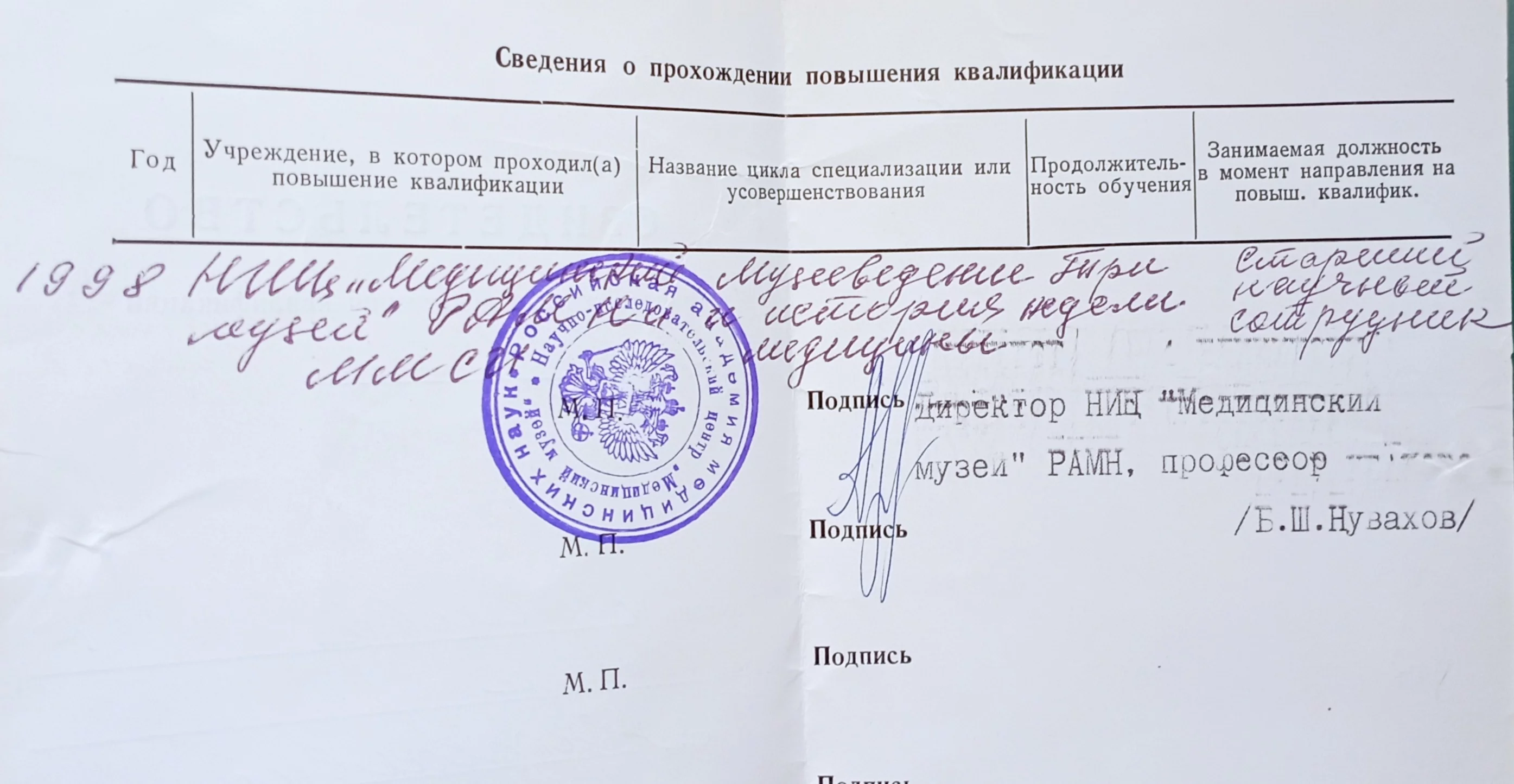 "Сегодня 16 июля", - записала в своем дневнике Вероника. " На улице стоит жара + 34+35 градусов. Этим летом такой жары еще не было. В здание музея никого не пускают. Музей ликвидируется, и впереди никаких перспектив. Зарплату не платят и не обещают. По поводу этого коллектив музея подал в суд на РАМН. Во вторник у нас было собрание в Академии медицинских наук на Солянке у Президента РАМН Покровского Валентина Ивановича. Кабинет у него просторный, высокий потолок, длинный стол, черные кожаные кресла, на шкафах стоят бюсты Гиппократа и других медиков, красивые вазы, часы. Так уютно и хорошо. Собрание было долгим - 2 или 3 часа. Речь шла о музее, о зарплате, о дальнейших перспективах. Покровский сказал, что НИЦ " Медицинский музей" закроют, а в сентябре опять откроют, но уже музей истории медицины, и будет он в другом месте".