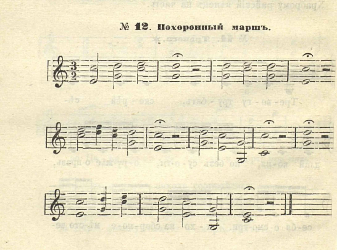 Продолжение. Как только процессия с гробом тронется с места, музыканты, не прекращая играть молитву, заходясь плечом и следуют за гробом после лиц, участвующих в процессии; когда же последней части будет скомандовано на плечо, музыканты начинают играть похоронный марш, чередуясь с барабанщиками.