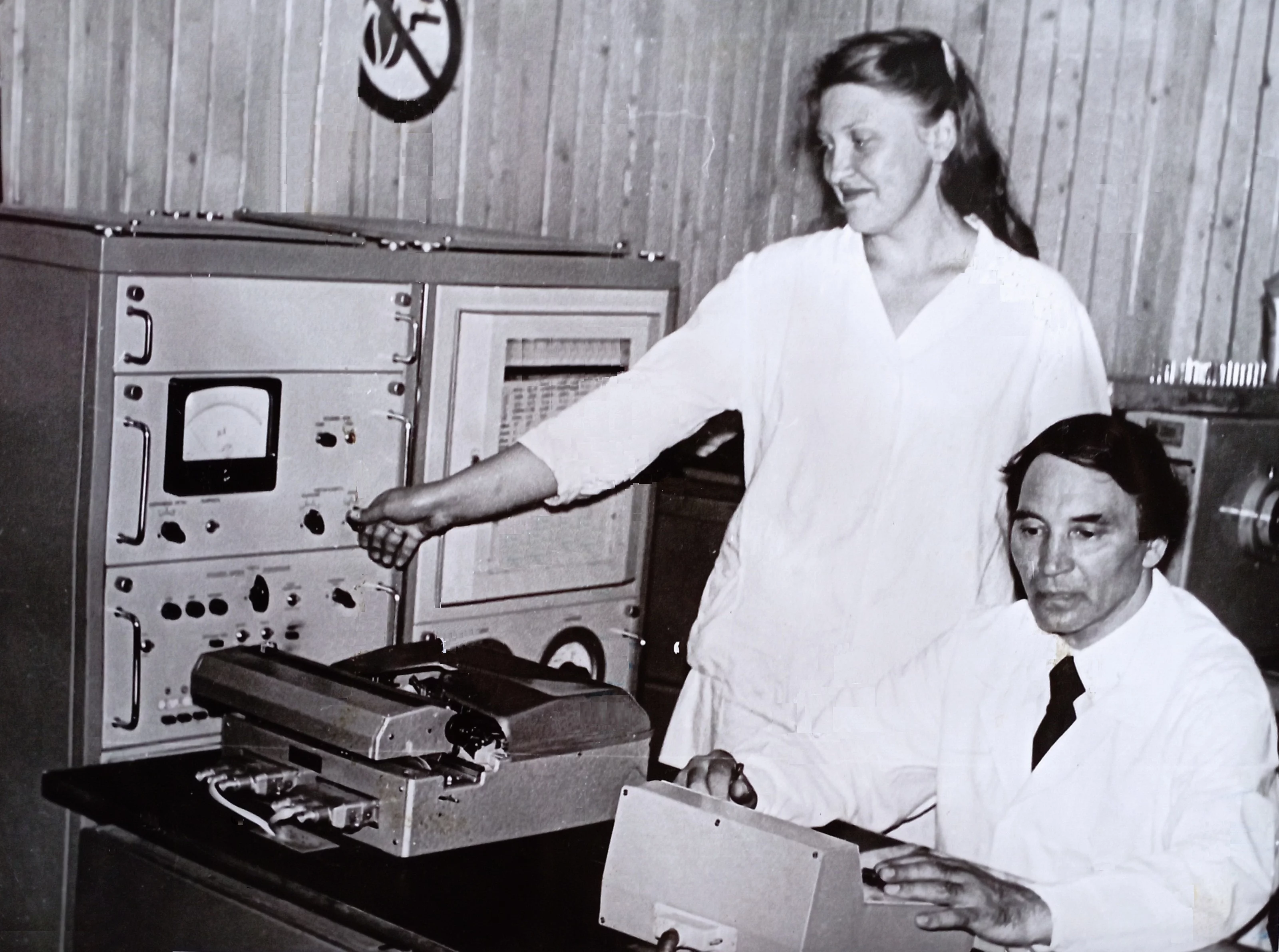 Томский атомный реактор. Лаб. корпус. Зав.отд.спектрального анализа ЦНИЛ.с.н.с. Н.П.Тимакин, Ярослав Степанович Васильцев и ст.инженер С.И.Шелудько анализируют сод-е ми-ов в субклеточных структурах. 1977 год.