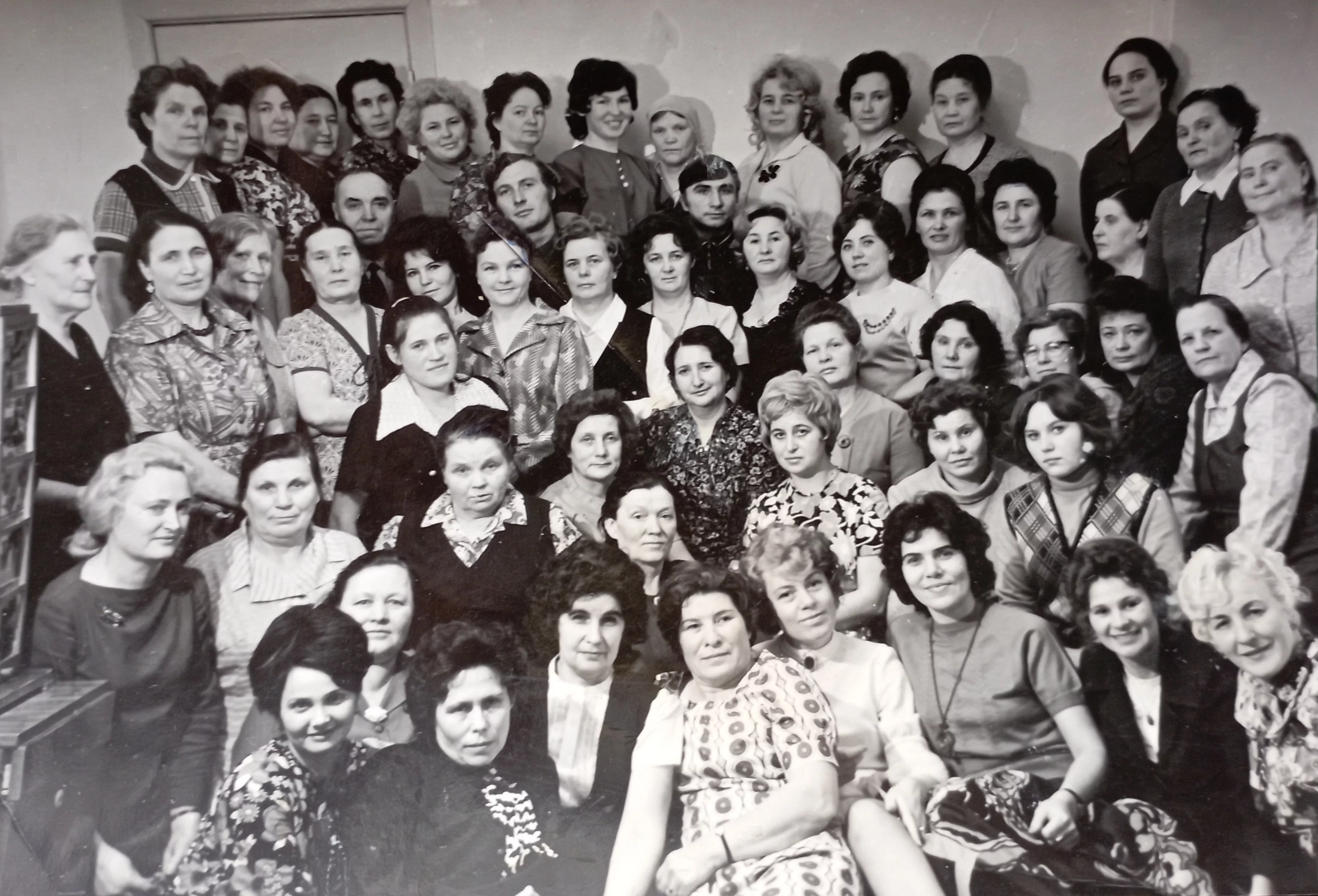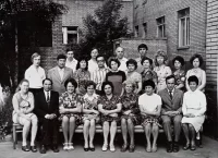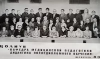 Нижний ряд слева направо: Наталья Михайловна,старший лаборант кафедры, Николай Петрович Тимакин,ст.науч.сотр.г.Томск, Людмила Ивановна Куликова. ст.преп. кафедры, Галина Дмитриевна Савина, ст.лаборант кафедры, Неля Ковкасовна Давтян, доцент, зав.курсов,Марианна Федоровна Бондаренко, зав.кафедры, Матлюба Хилаловна Войнова, преп., Николай Степанович Виниченко, асс.Воро., Улболсын Ишматовна Исказиева, асс.Актюбинск,