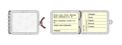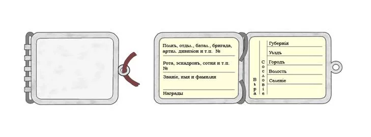 Несколько лет тому назад, просматривая в фондах ГИБ, приказы 1916-17 годов, я увидел и такой рисунок, приведенный ниже. Так как в разрешении ксерокопирования, из-за ветхости печатного фондового документа, мне было отказано, то аккуратно перерисовал медальон и переписал текст от руки. Медальон, возможно, имеет отклонение в размерах - на 1-2 мм. Буквы в графах "Вера" и "Сословие" в оригинале расположены перпендикулярно "Губернии" и др. (За неимением технических средств выполнить не удалось).