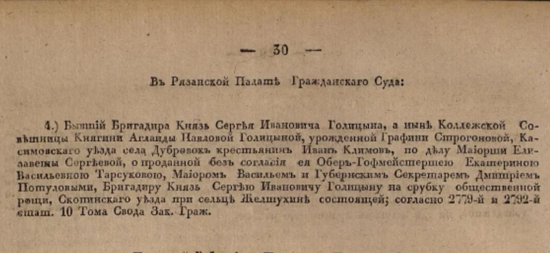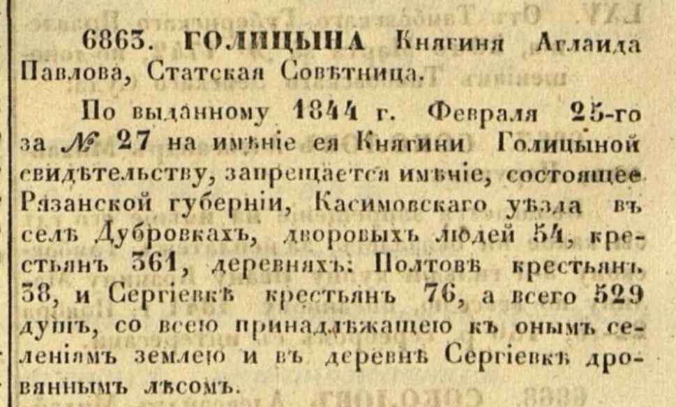 14. (В 1859 году в селе Дубровки Касимовского уезда Рязанской губернии 1724 д. м. п.крестьян, 364 двора, 5024 десятин земли. Владельцы — Василий Сергеевич Голицын (1794-1836), Аглаида Павловна Голицына и их сын Владимир Васильевич Голицын (1830-1886)/ Тормышов В.С. " Земельные владения рода Голицыных».2007 год).