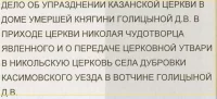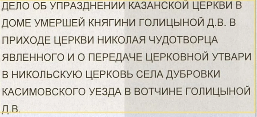 1. В доме Голицыной (Гагариной) Дарьи Васильевны в Москве была Казанская церковь. После смерти княгини в 1780 году церковную утварь передали в Никольскую церковь села Дубровки.
