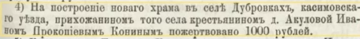 10. На построение нового храма в Дубровках в 1892 году крестьянин деревни Акуловой Иван Прокопиевич Конин пожертвовал 1000 рублей.![]()