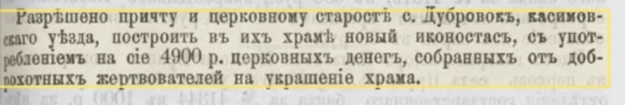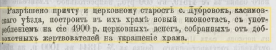 9. Разрешено в Никольском храме села Дубровки на 4900 рублей церковных денег построить новый иконостас.