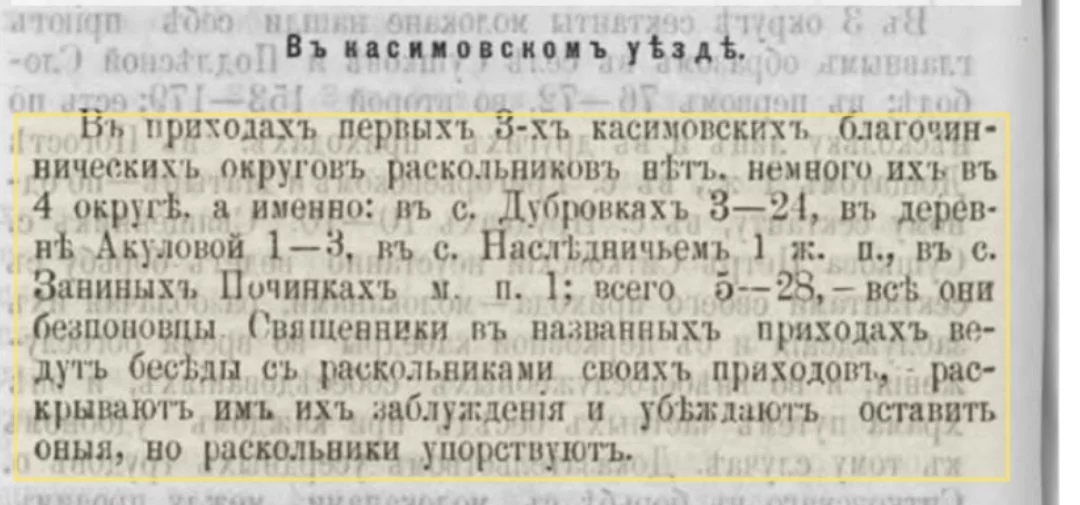 8.Раскольники ( беспоповцы) жили (и то их было немного) только в 4 благочинии Касимовского округа - село Дубровки, деревня Акулово, Наследничье, Занины-Починки.![]()