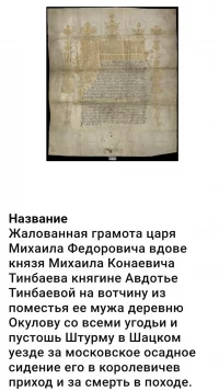 5. В мае 1619 года царь Михаил Федорович жалует деревню Окулову и пустошь Штурму вдове княгине Авдотье Тинбаевой за московское осадное сидение и смерть в походе ее мужа. Жалованная грамота находится в Государственном Историческом музее.