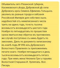 20 . После отмены крепостного права жизнь крестьян регулировало Волостное Правление. В 1885 году уроженцы Дубровок, Семен Ефимович Гольцын, сын Ефима Прохоровича, и его жена Неонила Григорьевна, должны были испросить разрешение у Волостного Правления на поездку в Астрахань. Правление разрешило им поехать на 1 год.![]()