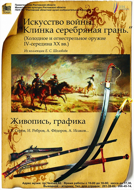 | 28 марта в 16-00 в Ростовском областном музее изобразительных искусств (пр. Чехова, 60) открывается уникальная выставка "Искусство войны. Клинка серебряная грань» (Русское и восточное холодное и огнестрельное оружие IV – сер. XX вв., живопись, графика из фондов музея и частных коллекций». ... |