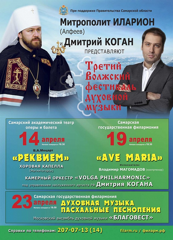 С 14 по 28 апреля 2014 года в Самарской области при поддержке Правительства Самарской области и с благословения Митрополита Самарского и Сызранского Сергия, будет проходить Третий Волжский фестиваль духовной музыки. Инициаторами и главной движущей силой фестиваля являются Председатель отдела внешних церковных связей – Митрополит Волоколамский ИЛАРИОН (Алфеев) и замечательный музыкант, скрипач с мировым именем, заслуженный артист России Дмитрий КОГАН. ... |