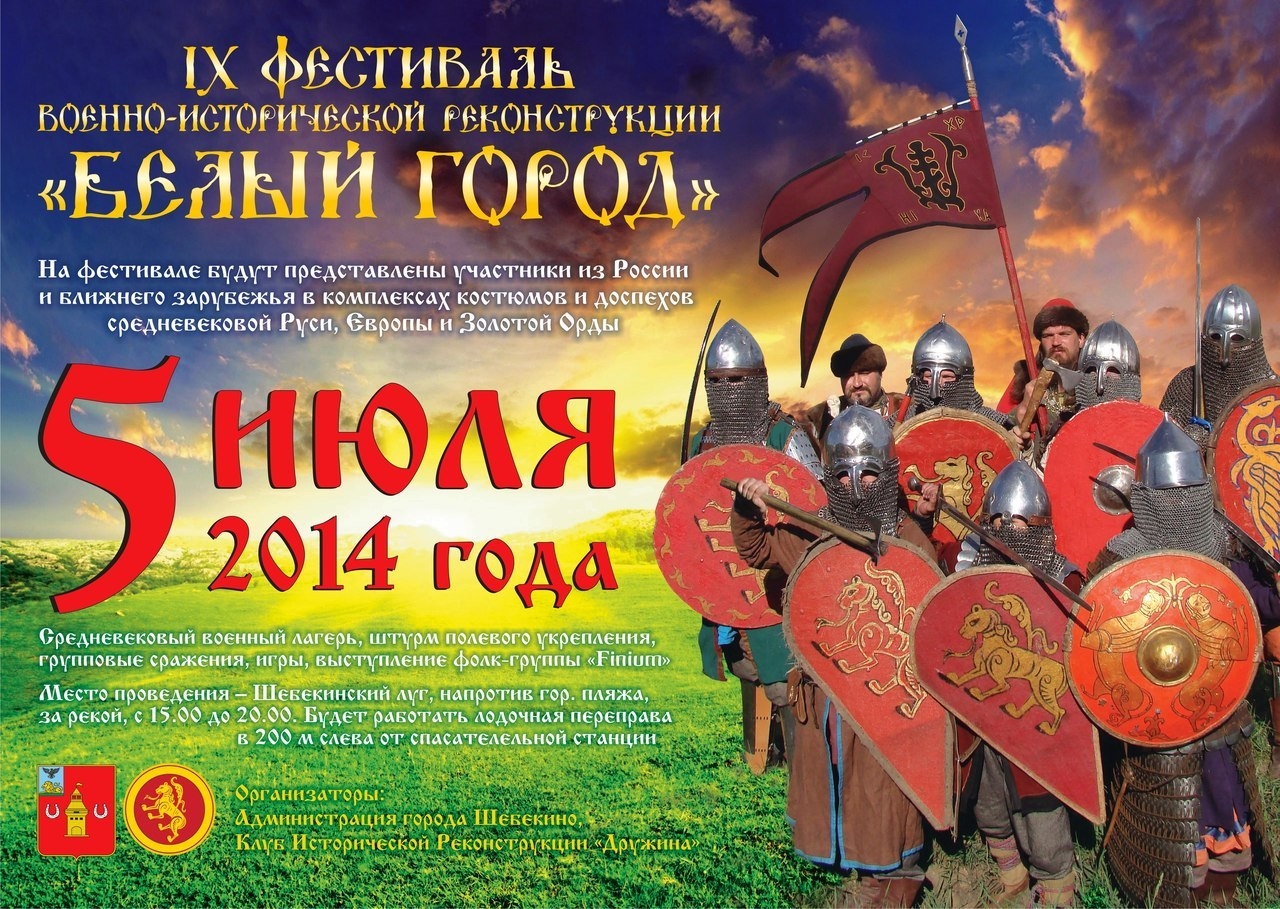 IX Военно-исторический фестиваль "Белый город» и его организаторы — белгородский клуб исторической реконструкции "Дружина» — ждут гостей на Заячьем лугу, вблизи города Шебекино, 5 июля 2014 года с 15:00 до 20:00. Традиционно на берегу реки Нежеголь будет возведён средневековый военный лагерь, огороженный крепостной стеной с дозорными башнями и воротами. Здесь воссоздадут элементы быта, костюма и вооружения XIII-XV вв. Европы, Руси и Золотой Орды. Более 150 человек из разных городов России прибудут на Белгородчину, чтобы, восстанавливая исторические реалии, приблизиться к лучшему пониманию истории. ... |