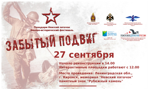 7 сентября 2015 года на мемориале «Невский пятачок» (Ленинградская область, Кировский район, поселок Дубровка, шоссе С.-Петербург-Шлиссельбург, левый берег Невы) пройдет военно-исторический фестиваль, посвященный первой попытке прорыва Блокады Ленинграда.