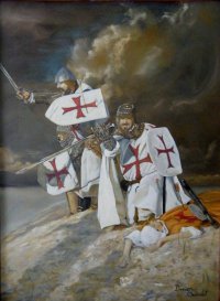 | Нас донимают день и ночь Пустынные шакалы. Никто не сможет нам помочь. Рука рубить устала. Она устала и колоть, И наносить удары, Мечом пронзая вражью плоть, В кровавой гуще свары. И близится последний час, Час нашей смерти честной... Бог Саваоф! Помилуй нас! Прими в Свой рай небесный! |