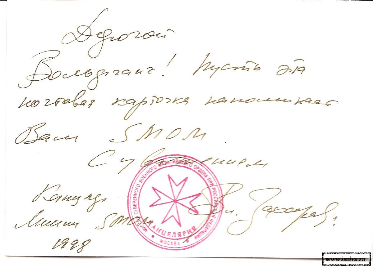 Данная миниатюра, написанная Вольфгангом Викторовичем Акуновым в 2003 г., была впервые опубликована им (под названием "Рыцари Родоса") в военно-историческом журнале "Рейтар" №7 (4/2004) и №8 (5/2004). Во второй раз миниатюра В. В. Акунова о родосских рыцарях, в значительно переработанном и дополненном варианте, была опубликована, под тем же названием "Рыцари Родоса", через четыре года, в книге В.В. Акунова "Божии дворяне". Очерки орденской традиции в Христианстве" СПб, 2006). Наша миниатюра так понравилась ведущему отечественному специалисту по истории Мальтийского Ордена, Великому Приору Российскому Ордена Святого Иоанна Иерусалимского, бывшему канцлеру московской миссии Суверенного Военного (Рыцарского) Ордена (S.M.O.M.) и бывшему вице-президенту Русской Службы Помощи Суверенного Военного Мальтийского Ордена, кандидату исторических наук, войсковому старшине Центрального Казачьего Войска Владимиру Александровичу Захарову (не раз, в самых прочувствованных выражениях, заверявшему нас в своих искренних дружеских чувствах - см. прилагаемую карточку, заверенную подписью и печатью), что он попросил у автора разрешение вставить ее полный текст (без изменений) в текст написанной им совместно с В.Н. Чибисовым книги "Орден госпитальеров" (СПб, "Алетейя", 2009). К сожалению, досточтимый Приор и любезный брат В.А. Захаров, опубликовав наш текст о рыцарях Родоса в своей совместной с В.Н. Чибисовым книге, почему-то забыл сделать необходимую ссылку на подлинного автора - В.В. Акунова. Увы - с возрастом память иногда начинает нас подводить...