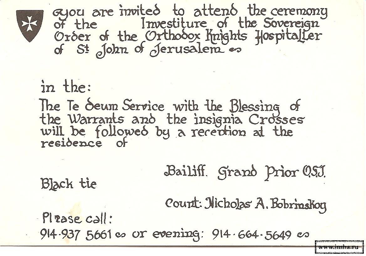 12. "Суверенного (Державного) Ордена Православных рыцарей-госпитальеров Святого Иоанна" (Sovereign Order of the Orthodox Knights Hospitallers of St. John) графа Н.А. Бобринского, а в 1974/75 гг. – в состав