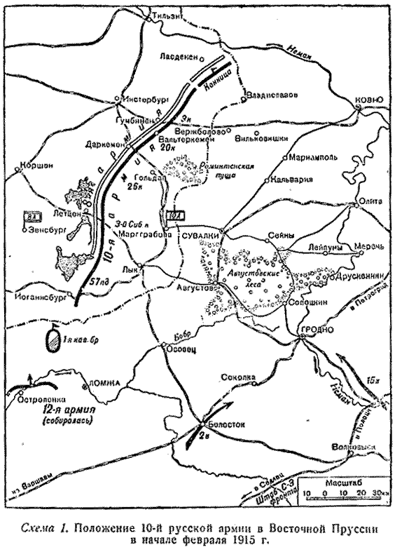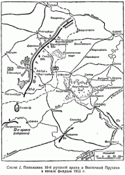 Схема 1. Положение 10-й русской армии в Восточной пруссии в начале февраля 1915 г. |