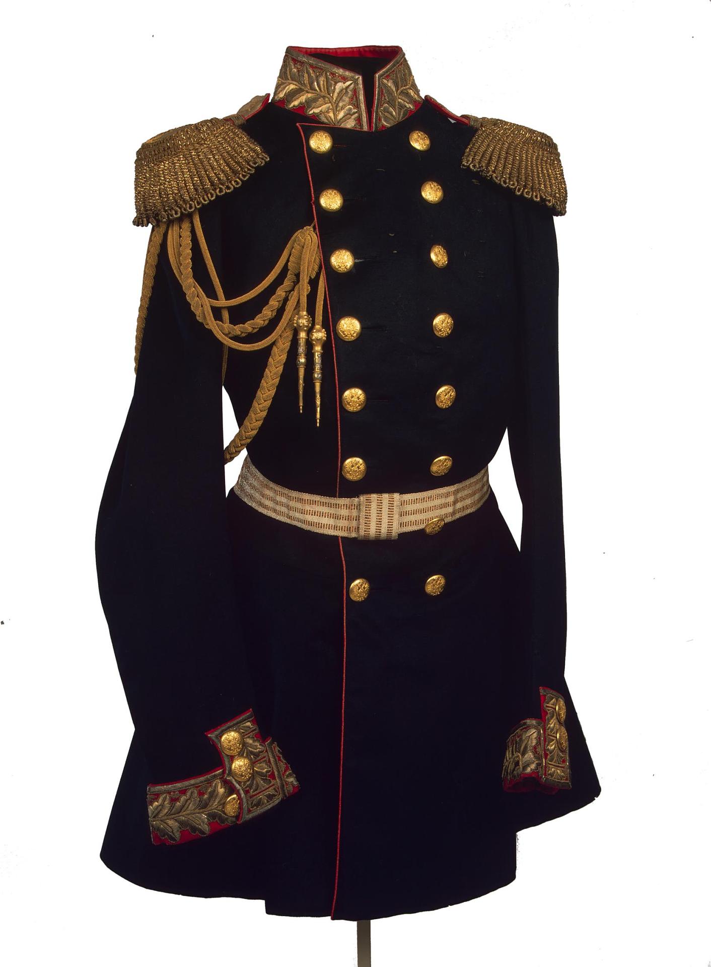 Мундир генеральский, принадлежавший Александру II.Россия, 1855 г. Сукно, шелк, томпак, металлическая нить, металлический шнур, медь, картон, парча, канитель, вышивка, штамповка, серебрение, золочение, плетение, дл. мундира 95, дл. аксельбанта 110,5 см. |