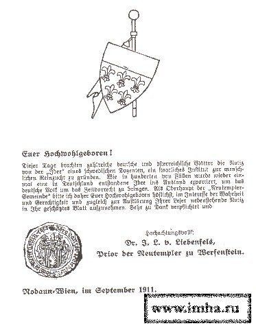 В 1902 г. Ланц, так сказать, сменил свою прежнюю идентичность на новую. Он изменил дату и место своего рождения, объявив, что родился в 1872 г. в городе Мессине на острове Сицилия, а также изменив во всех документы имя и фамилию своих родителей (что дало ход упомянутой нами выше второй версии его происхождения). Своим отцом он, вместо преподавателя гимназии Иоганна Ланца, объявил барона Иоганна Ланца де Либенфельза - отпрыска древнего швабского дворянского рода; своей матерью - Катарину Скала. Вопрос о подлинном происхождении Адольфа Георга Ланца до сих пор окончательно не прояснен (как и вопрос о том, имел ли Ланц академическую степень доктора наук). Во всяком случае, Г(в)идо фон Лист опубликовал генеалогическое древо своего ученика и соратника, дав подробное описание "подлинного арманического и феманического" родового герба "барона Ланца фон Либенфельза".