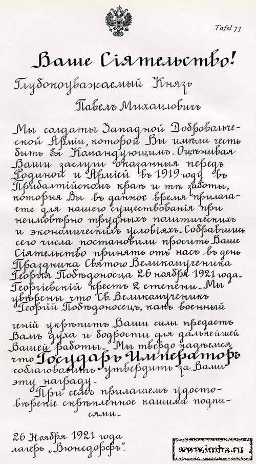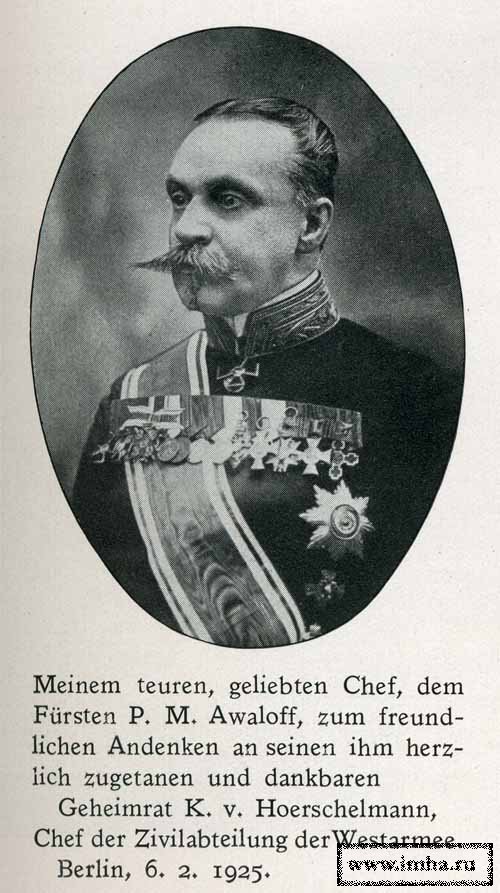 "...Вдоль всей Дворцовой улицы были выстроены русские войска. У церковных врат стояли в карауле двадцать георгиевских кавалеров. Богослужение началось уже давно, и протиснуться в храм было уже невозможно. Оттуда доносилось пение церковного хора, мощью и красотой не уступавшее органной музыке, но все заглушал могучий бас иеродиакона. Наконец, богомольцы вышли из церковных врат – нескончаемый поток сверкающих орденами фигур. Шагавший легкой поступью молодого человека граф фон дер Гольц в блестящей островерхой каске мирного времени, многочисленные офицеры его штаба с малиновыми кантами на бриджах. "Как странно и скромно они смотрятся среди русских!», - шепнул Раймерс Вольмайеру, стоявшему рядом.