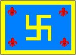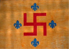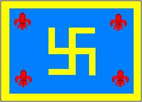 2) Знамя с "должностным» гербом самого Ланца, как Приора и Великого Магистра Ордена "новых храмовников» (ОНТ). Этот герб (который не следует путать с составленным Г(в)идо фон Листом и описанным нами выше фамильным "арманическим и феманическим гербом Ланца фон Либенфельза»), представлял собой "норманнской» ("варяжской») формы щит, имевший во главе красную правостороннюю свастику на серебряном поле, а в нижней части - пять золотых геральдических лилий на лазурном поле (что, по наиболее распространенному толкованию, означало конечное торжество храмовнической идеи над разгромившей исторический Орден Храма в начале XIV в. французской монархией).