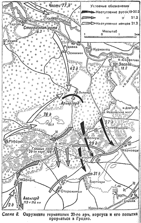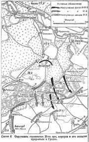 Схема 5. Окружение германцами 20-го арм. корпуса и его попытка прорваться в Гродно. |