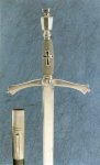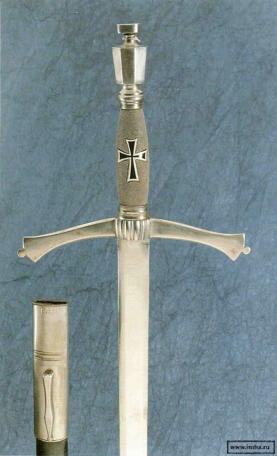 На приведенной нами иллюстрации изображен один из сохранившихся до наших дней парадных мечей кавалера Тевтонского рыцарского ордена (нем.: Deutscher Ritterorden, лат.: Ordo Militaris T(h)eutoniсorum) эпохи Габсбургов. У этого меча прямой, обоюдоострый клинок и деревянная рукоятка, обтянутая серой кожей ската и украшенная черным, с белой каймой по краям, эмалированным лапчатым орденским крестом тевтонов. На навершии меча выгравирован герб Тевтонского ордена. Черные кожаные ножны украшены посеребренными накладками из белого металла.![]()