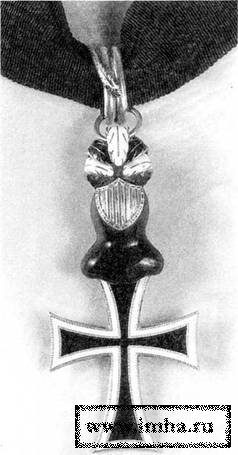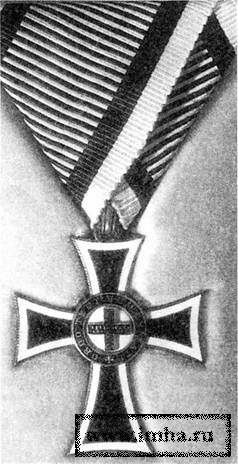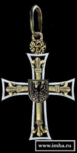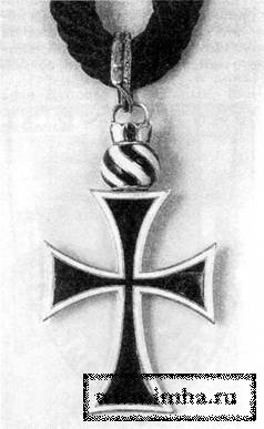 Члены "марианской ветви" Тевтонского ордена носили на черно-белой полосатой ленте особый шейный крест, отличавшийся от обычного тевтонского креста наличием в перекрестье круглого медальона с прямым красным крестом на белом поле и черным ободком с надписью по кругу серебряными буквами "Орден Тевт(онского) Человеколюбия" (Ordo Teut. Humanitatis).