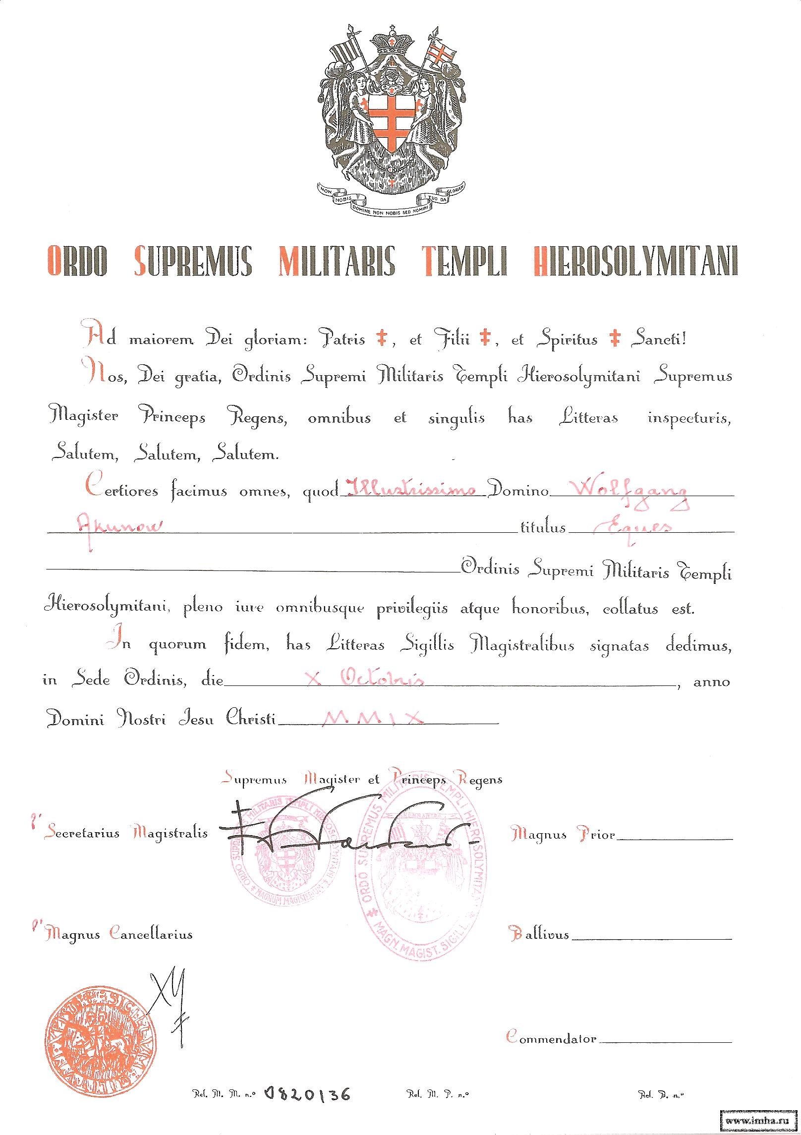 В 2009 г. Верховный Воинский Орден Иерусалимского Храма распространил свою деятельность и на Российскую Федерацию. Согласно данным, полученным из осведомленных источников, в России в настоящее время существует официально зарегистрированное в Министерстве юстиции РФ православное Великое Приорство Российское (Московское), или же Великий Приорат Российский (Московский) во имя Святого Благоверного князя Александра Невского, состоящее из 2 командорств: