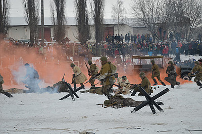 | реконструкции участвовали почти полторы тысячи человек из военно-исторических клубов России и других стран. Сценарий готовили на основе исторических документов и воспоминаний участников операции. Для представления в парк привезли военную технику тех лет — танки, артиллерию и бронеавтомобили. В небе показали воздушный бой истребителей Ла-7 и Messerschmitt. Кульминацией реконструкции стало водружение знамени Победы над Рейхстагом и подписание капитуляции военного коменданта Берлина. |