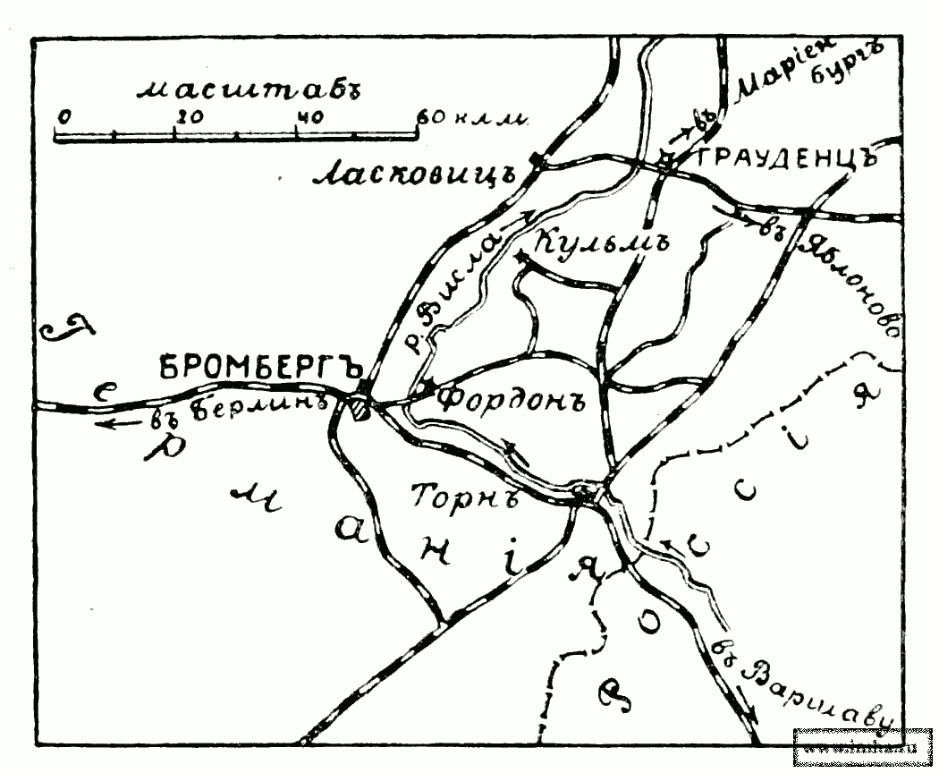 По Торнскому миру в 1466 г. Грауденц подпал под протекторат Польши. Город Грауденц состоит во владении Пруссии с 1772 г. и в 1776 г. в 1? вер. от него, на отдельной возвышенности, Фридрихом Великим была заложена крепость, ныне цитадель, известная под названием крепостцы Курбиер; сомкнутая долговременная ограда с несколькими наружными вспомогательными постройками примкнута к реке. В кампанию 1806-07 гг. легкие французские части окружили Грауденц и заняли город 17 января 1807 г., но тотчас же отошли, в виду известия о приближении прусского корпуса Лестока. ... |