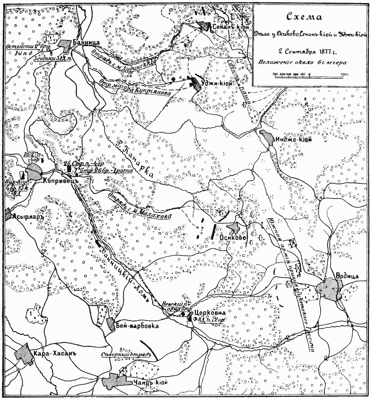 Осиково, деревня в Болгарии, в 5 вер. к северу от Церковны; известна боевыми столкновениями, бывшими в окрестностях ея осенью 1877 г. (см. Рущукский отряд и Церковна). После рекогносцировочных боев 30-31 августа у Церковны, командир XIII корпуса генерал-лейтенант Ган решил перейти в наступление, с целью утвердиться на правом берегу Банницкого Лома, для чего приказал на 2 сентября отряду генерал-майор Дудинского (из Банницы) овладеть Уджикиоем и Сенанкиоем, а генерал-лейтенанту кн. Манвелову (от Копривца) — Осиково. ... |