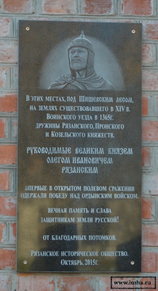 В пятницу 30 октября 2015 г. состоялось открытие памятной плиты Великому князю Олегу Ивановичу Рязанскому на стене Никольского храма в селе Задубровье Шиловского района Рязанской области. В этих местах, под Шишевским лесом, на землях существовавшего в XIV веке Воинского уезда в 1365 году дружины Рязанского, Пронского и Козельского княжеств, руководимые великим князем ОЛЕГОМ ИВАНОВИЧЕМ РЯЗАНСКИМ впервые в открытом полевом сражении одержали победу над ордынским войском. |