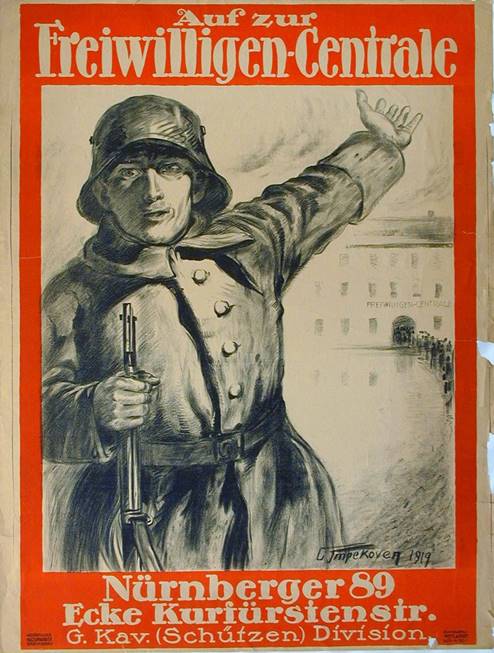 Белые добровольцы в Прибалтике (1919): слева направо: кавалерист Ударного отряда Охраны Прибалтийского края, ст. лейтенант Россбах, доброволец Железной дивизии Западной Добровольческой Армии князя Авалова (Бермондта)